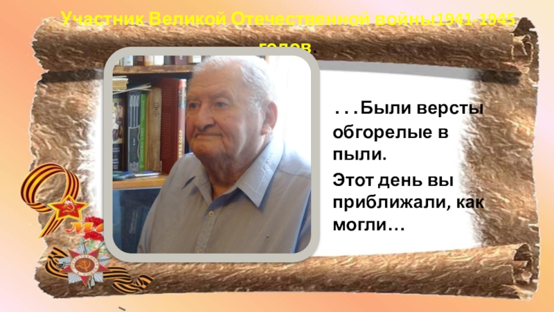 Участник Великой Отечественной войны1941-1945 годов.…Были версты обгорелые в пыли.Этот день вы приближали, как могли…