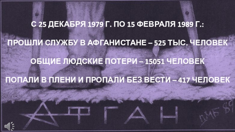 С 25 ДЕКАБРЯ 1979 Г. ПО 15 ФЕВРАЛЯ 1989 Г.:ПРОШЛИ СЛУЖБУ В АФГАНИСТАНЕ – 525 ТЫС. ЧЕЛОВЕКОБЩИЕ