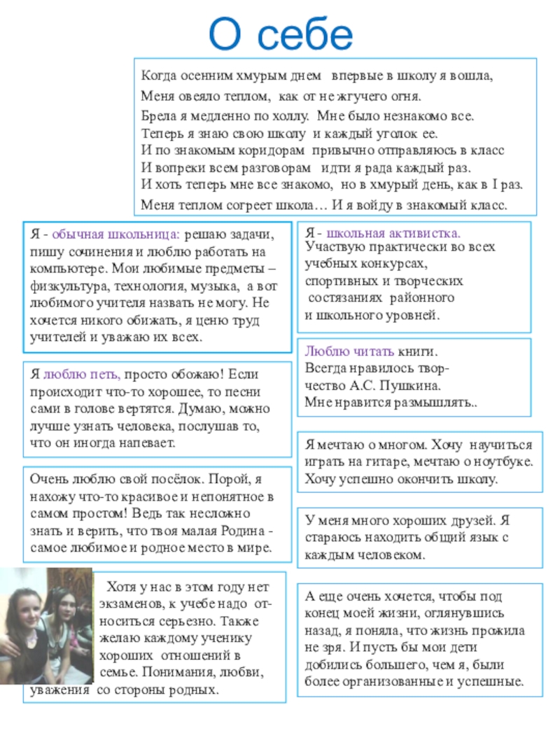 Я - обычная школьница: решаю задачи, пишу сочинения и люблю работать на компьютере. Мои любимые предметы – физкультура, технология, музыка, а вот любимого учителя назвать не могу. Не хочется никого обижать, я ценю труд учителей и уважаю их всех.