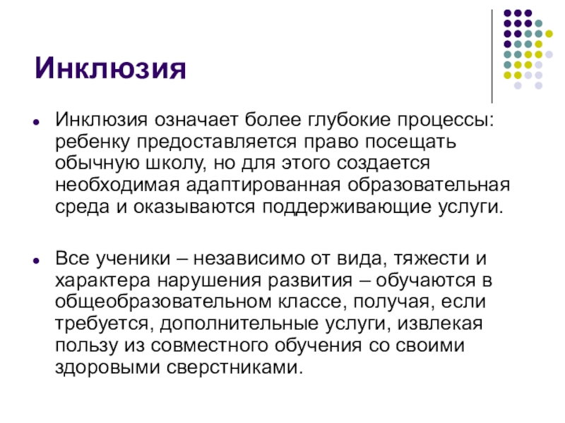 Инклюзия означает более глубокие процессы: ребенку предоставляется право посещать обычную школу,
