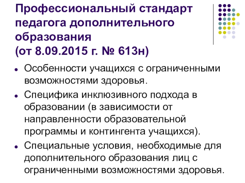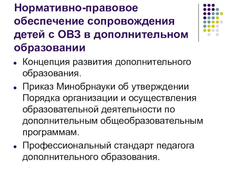 Слайд 8Нормативно-правовое обеспечение сопровождения детей с ОВЗ в дополнительном образовании