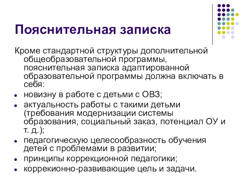 Кроме стандартной структуры дополнительной общеобразовательной программы, пояснительная записка адаптированной образовательной