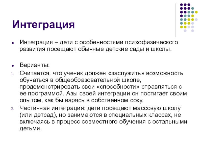 Считается, что ученик должен «заслужить» возможность обучаться в общеобразовательной школе, продемонстрировать свои «способности» справляться с ее программой. Азы своей интеграции он постигает своим опытом, как бы варясь в собственном соку.