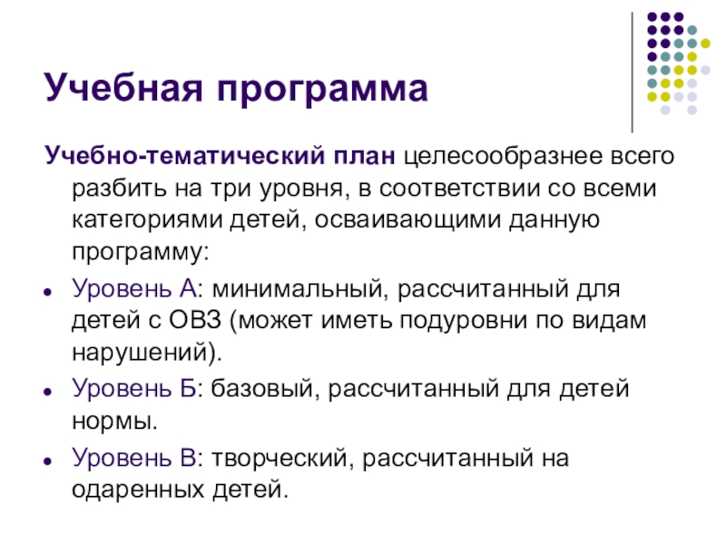 Учебно-тематический план целесообразнее всего разбить на три уровня, в соответствии