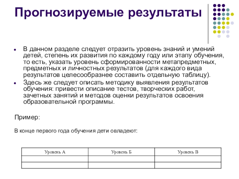 степень их развития по каждому году или этапу обучения, то есть, указать уровень сформированности метапредметных, предметных и личностных результатов (для каждого вида результатов целесообразнее составить отдельную таблицу).