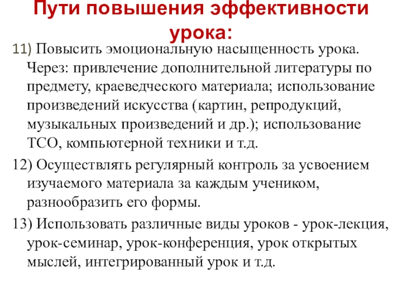 13) Использовать различные виды уроков - урок-лекция, урок-семинар, урок-конференция, урок открытых мыслей, интегрированный урок и т.д.
