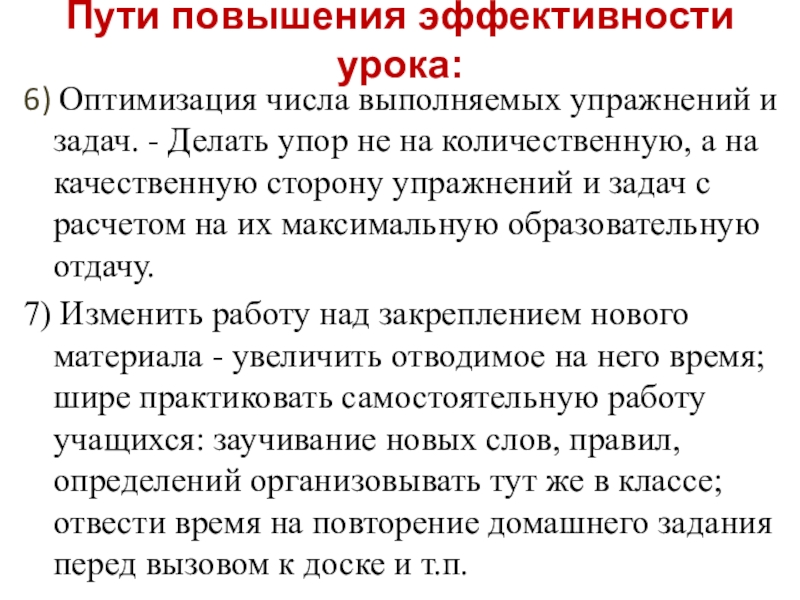 Слайд 246) Оптимизация числа выполняемых упражнений и задач. - Делать упор не
