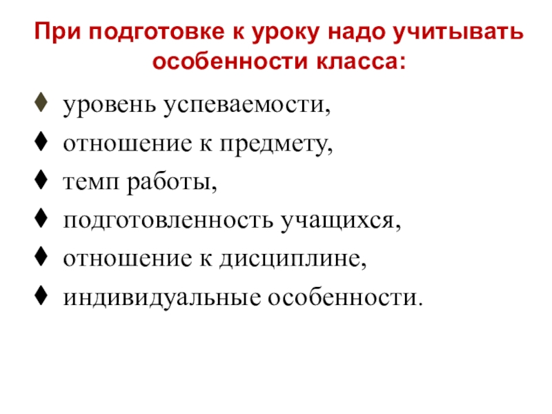 Слайд 15При подготовке к уроку надо учитывать особенности класса: