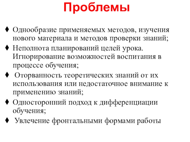 Однообразие применяемых методов, изучения нового материала и методов проверки знаний;