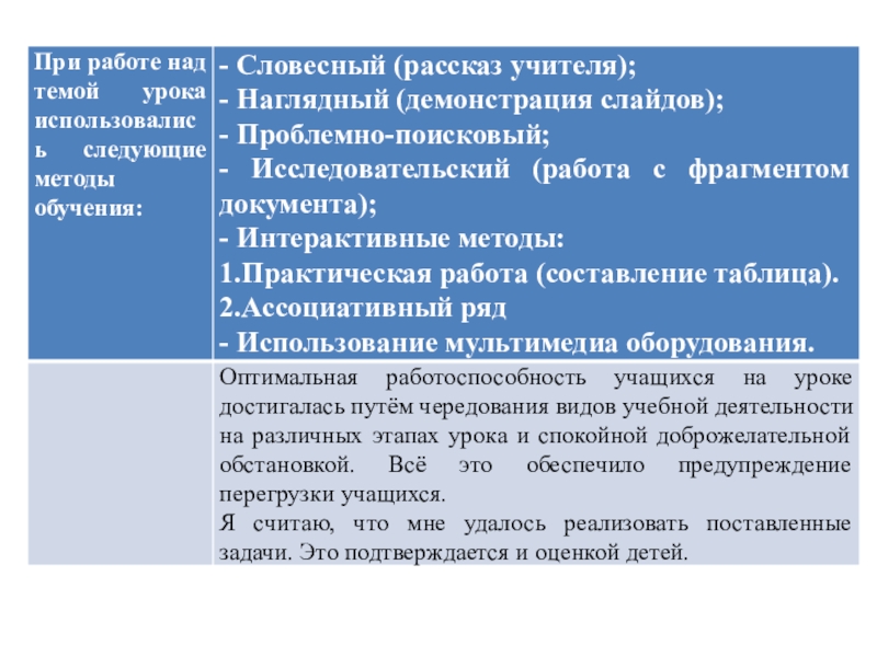 10) Разнообразить виды учебной деятельности на уроке: сочетать объяснительно-иллюстративные методы обучения с проблемными; включать творческие работы учащихся (рефераты, доклады, сообщения); включать разнообразные игровые моменты и т.п.
