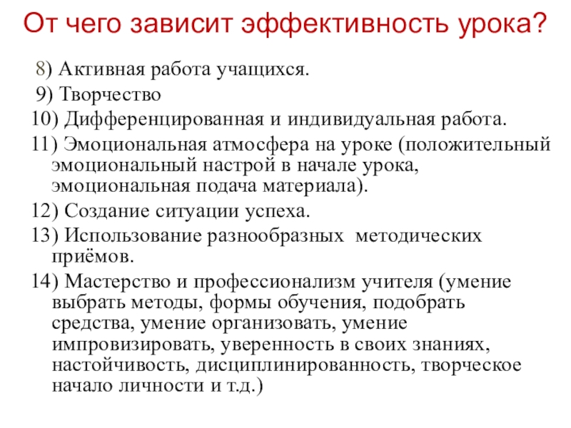 14) Мастерство и профессионализм учителя (умение выбрать методы, формы обучения, подобрать средства, умение организовать, умение импровизировать, уверенность в своих знаниях, настойчивость, дисциплинированность, творческое начало личности и т.д.)