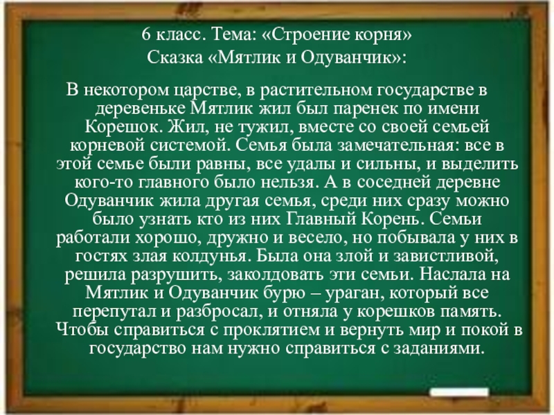 в растительном государстве в деревеньке Мятлик жил был паренек по имени Корешок. Жил, не тужил, вместе со своей семьей корневой системой. Семья была замечательная: все в этой семье были равны, все удалы и сильны, и выделить кого-то главного было нельзя. А в соседней деревне Одуванчик жила другая семья, среди них сразу можно было узнать кто из них Главный Корень. Семьи работали хорошо, дружно и весело, но побывала у них в гостях злая колдунья. Была она злой и завистливой, решила разрушить, заколдовать эти семьи. Наслала на Мятлик и Одуванчик бурю – ураган, который все перепутал и разбросал, и отняла у корешков память. Чтобы справиться с проклятием и вернуть мир и покой в государство нам нужно справиться с заданиями.