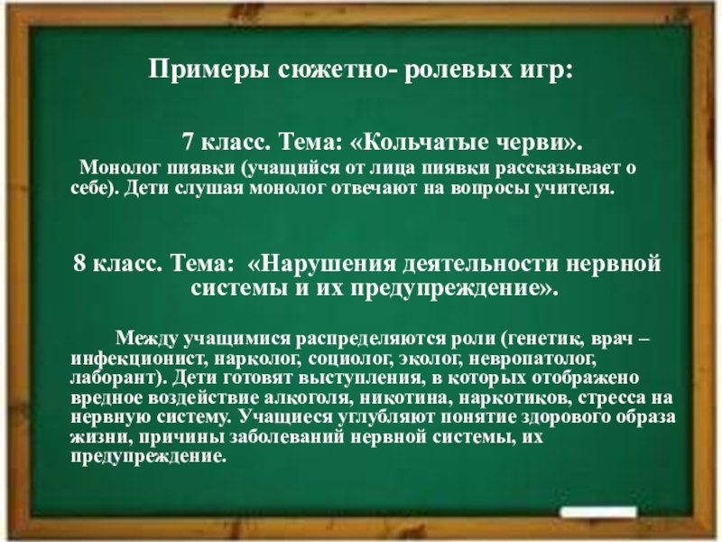 Между учащимися распределяются роли (генетик, врач – инфекционист, нарколог, социолог, эколог, невропатолог, лаборант). Дети готовят выступления, в которых отображено вредное воздействие алкоголя, никотина, наркотиков, стресса на нервную систему. Учащиеся углубляют понятие здорового образа жизни, причины заболеваний нервной системы, их предупреждение.