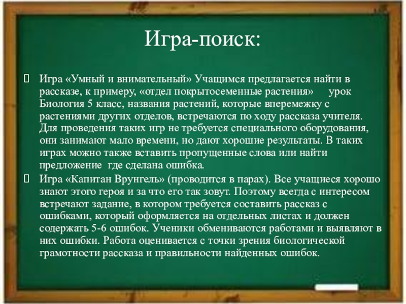 Игра «Капитан Врунгель» (проводится в парах). Все учащиеся хорошо знают этого героя и за что его так зовут. Поэтому всегда с интересом встречают задание, в котором требуется составить рассказ с ошибками, который оформляется на отдельных листах и должен содержать 5-6 ошибок. Ученики обмениваются работами и выявляют в них ошибки. Работа оценивается с точки зрения биологической грамотности рассказа и правильности найденных ошибок.
