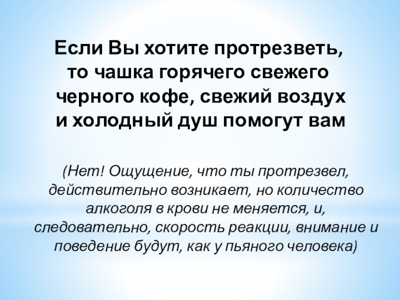 (Нет! Ощущение, что ты протрезвел, действительно возникает, но количество алкоголя в крови не меняется, и, следовательно, скорость реакции, внимание и поведение будут, как у пьяного человека)