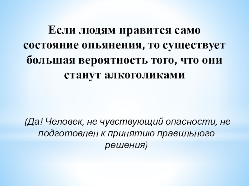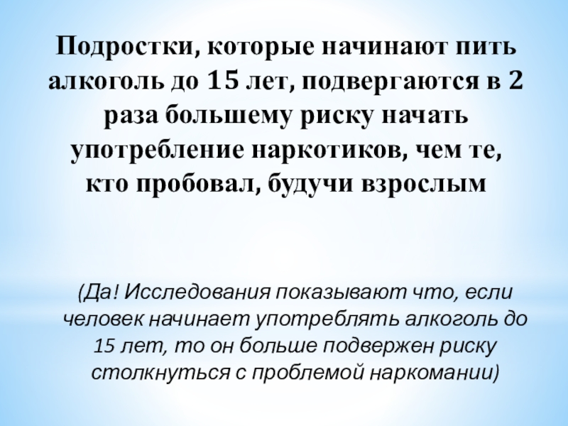 (Да! Исследования показывают что, если человек начинает употреблять алкоголь до 15 лет, то он больше подвержен риску столкнуться с проблемой наркомании)