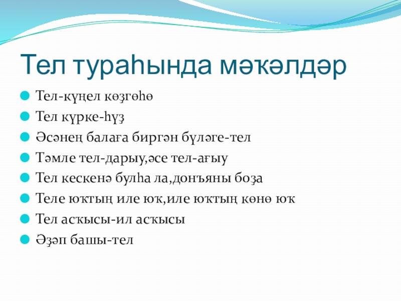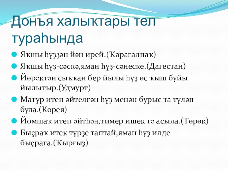 Слайд 11Халыҡтың теле-уның тормошоноң иң матур,мәңге һулымай торған сәскәһе ул.Телдә бөтә халыҡ