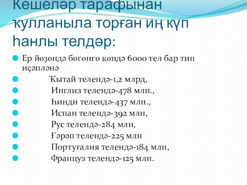 Слайд 6Кешеләр тарафынан ҡулланыла торған иң күп һанлы телдәр: