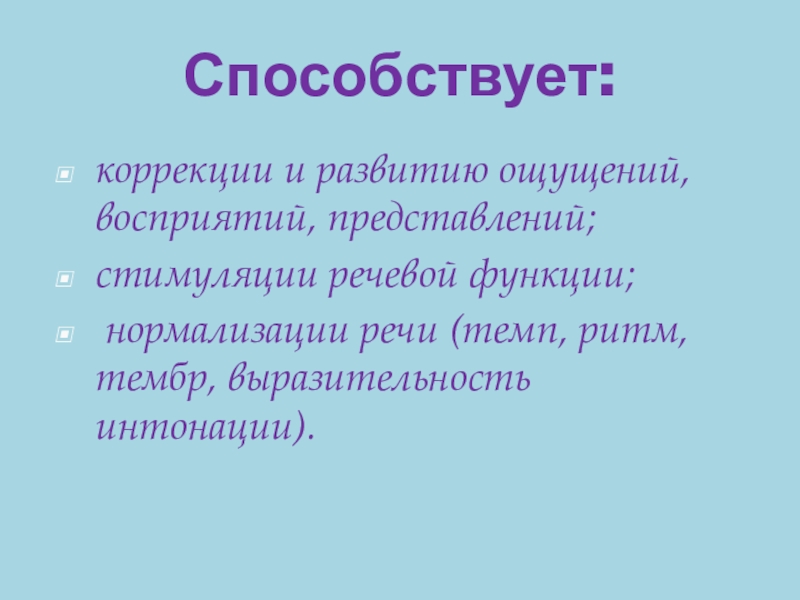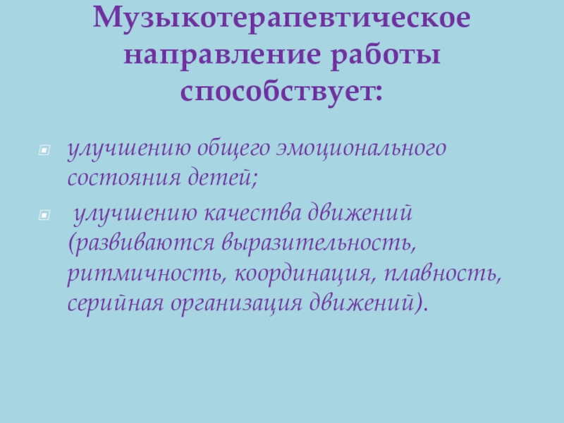 Слайд 65Музыкотерапевтическое направление работы способствует: