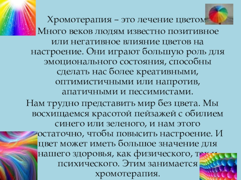 Нам трудно представить мир без цвета. Мы восхищаемся красотой пейзажей с обилием синего или зеленого, и нам этого достаточно, чтобы повысить настроение. И цвет может иметь большое значение для нашего здоровья, как физического, так и психического. Этим занимается хромотерапия.