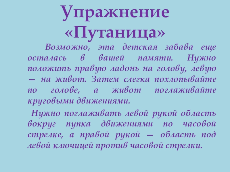 Нужно положить правую ладонь на голову, левую — на живот. Затем слегка похлопывайте по голове, а живот поглаживайте круговыми движениями.