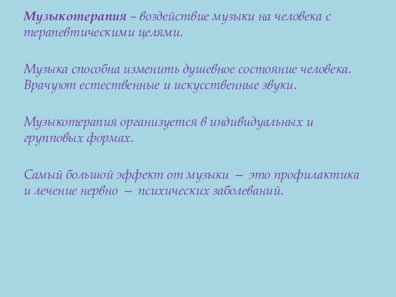 Слайд 64Музыкотерапия – воздействие музыки на человека с терапевтическими целями.