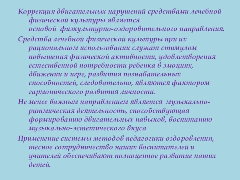 Слайд 90Коррекция двигательных нарушений средствами лечебной физической культуры является основой физкультурно-оздоровительного направления.