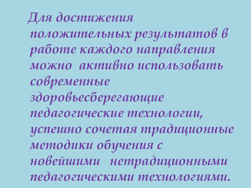 активно использовать современные здоровьесберегающие педагогические технологии, успешно сочетая традиционные методики обучения с новейшими нетрадиционными педагогическими технологиями.
