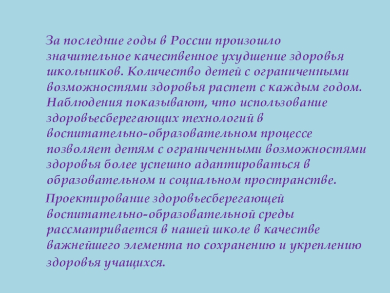 ухудшение здоровья школьников. Количество детей с ограниченными возможностями здоровья растет с каждым годом. Наблюдения показывают, что использование здоровьесберегающих технологий в воспитательно-образовательном процессе позволяет детям с ограниченными возможностями здоровья более успешно адаптироваться в образовательном и социальном пространстве.