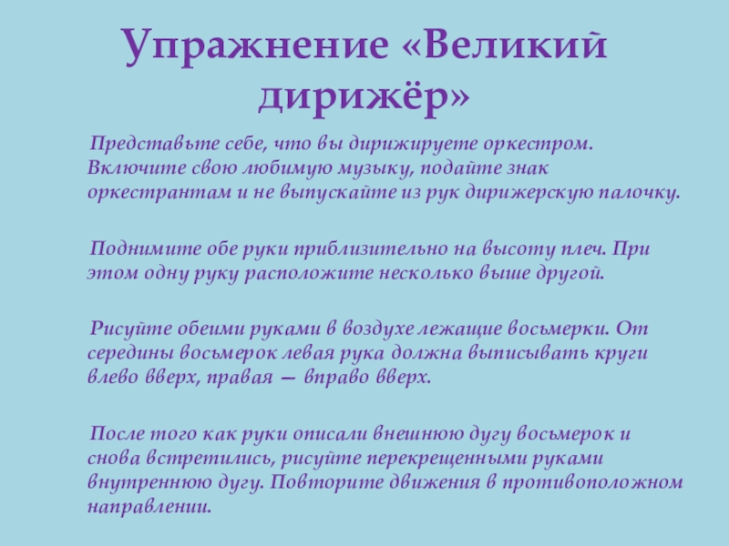 Рисуйте обеими руками в воздухе лежащие восьмерки. От середины восьмерок левая рука должна выписывать круги влево вверх, правая — вправо вверх.