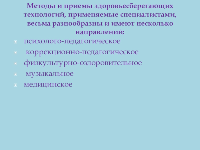 Слайд 6Методы и приемы здоровьесберегающих технологий, применяемые специалистами, весьма разнообразны и имеют