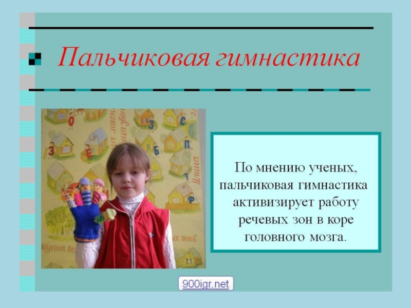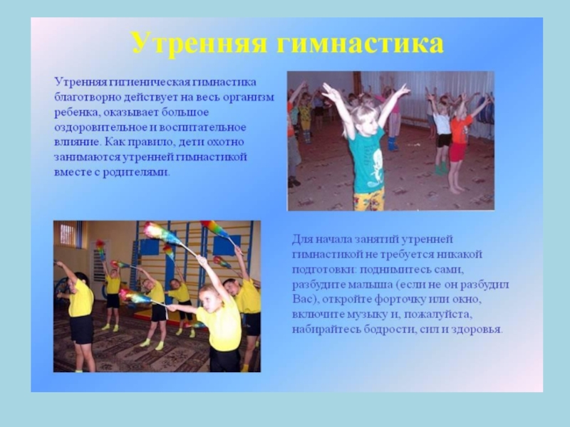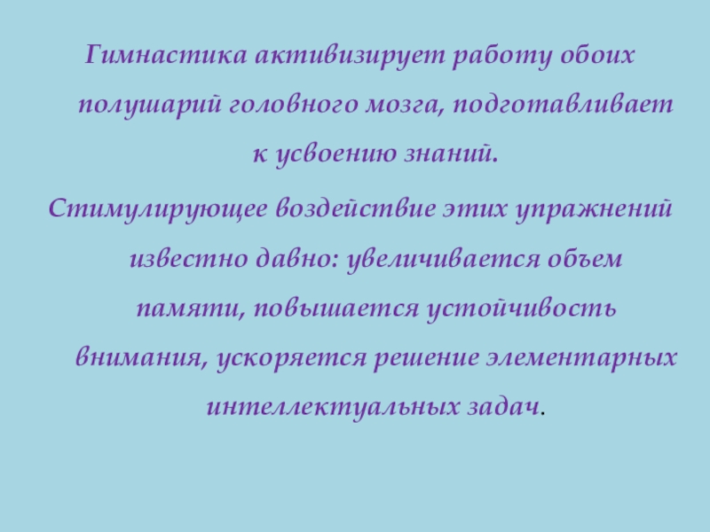 Слайд 10Гимнастика активизирует работу обоих полушарий головного мозга, подготавливает к усвоению знаний.