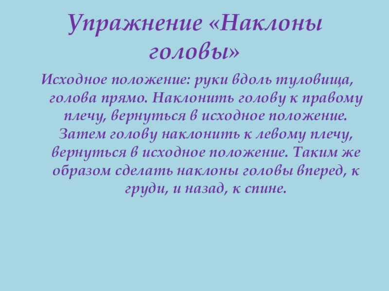 плечу, вернуться в исходное положение. Затем голову наклонить к левому плечу, вернуться в исходное положение. Таким же образом сделать наклоны головы вперед, к груди, и назад, к спине.