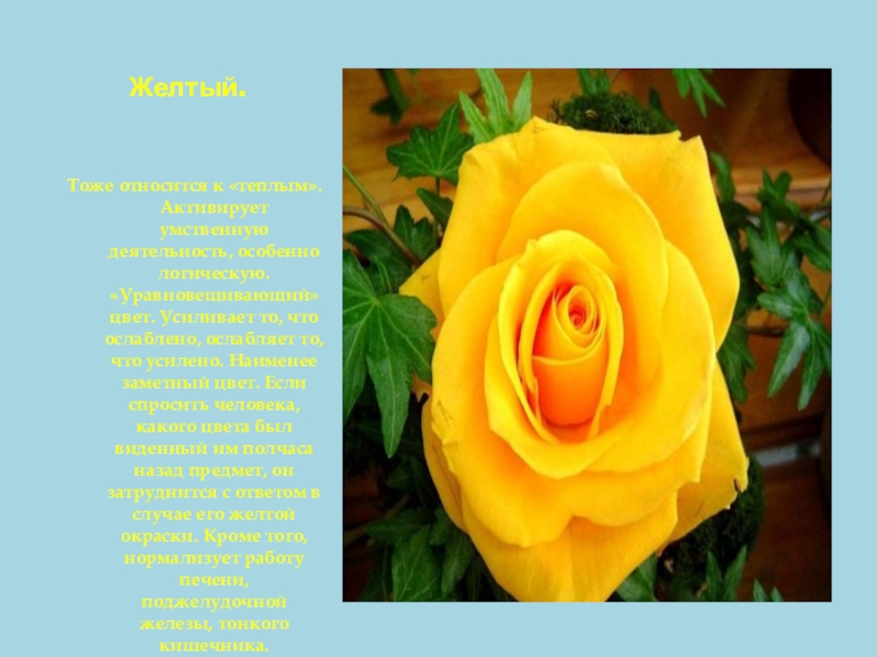 цвет. Усиливает то, что ослаблено, ослабляет то, что усилено. Наименее заметный цвет. Если спросить человека, какого цвета был виденный им полчаса назад предмет, он затруднится с ответом в случае его желтой окраски. Кроме того, нормализует работу печени, поджелудочной железы, тонкого кишечника.