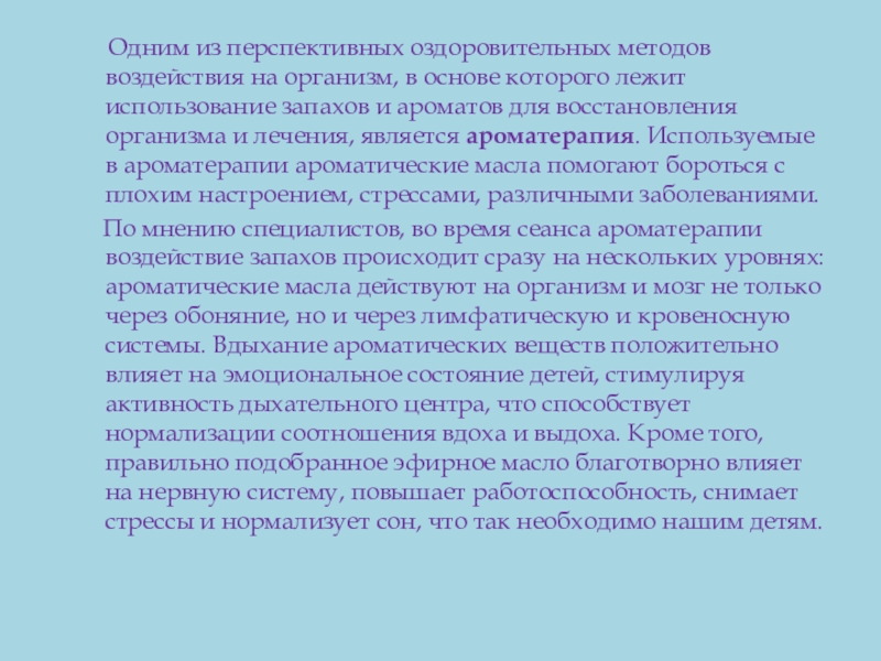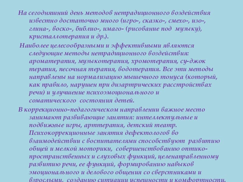 Наиболее целесообразными и эффективными являются следующие методы нетрадиционного воздействия: ароматерапия, музыкотерапия, хромотерапия, су-джок терапия, песочная терапия, водотерапия. Все эти методы направлены на нормализацию мышечного тонуса (который, как правило, нарушен при дизартрических расстройствах речи) и улучшение психоэмоционального и соматического состояния детей.