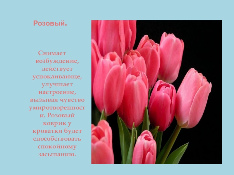 Снимает возбуждение, действует успокаивающе, улучшает настроение, вызывая чувство умиротворенности. Розовый