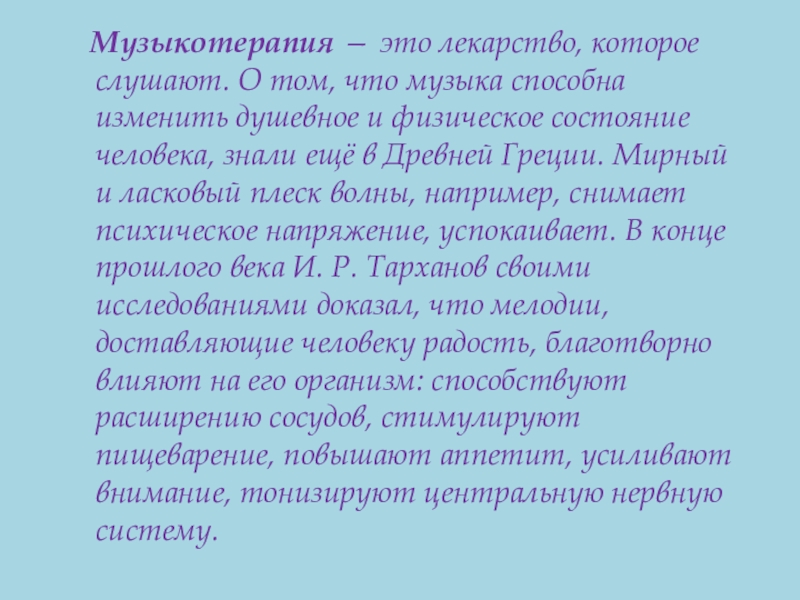 изменить душевное и физическое состояние человека, знали ещё в Древней Греции. Мирный и ласковый плеск волны, например, снимает психическое напряжение, успокаивает. В конце прошлого века И. Р. Тарханов своими исследованиями доказал, что мелодии, доставляющие человеку радость, благотворно влияют на его организм: способствуют расширению сосудов, стимулируют пищеварение, повышают аппетит, усиливают внимание, тонизируют центральную нервную систему.