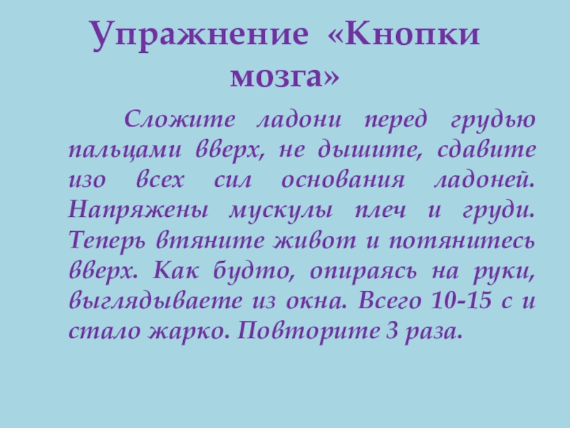 изо всех сил основания ладоней. Напряжены мускулы плеч и груди. Теперь втяните живот и потянитесь вверх. Как будто, опираясь на руки, выглядываете из окна. Всего 10-15 с и стало жарко. Повторите 3 раза.