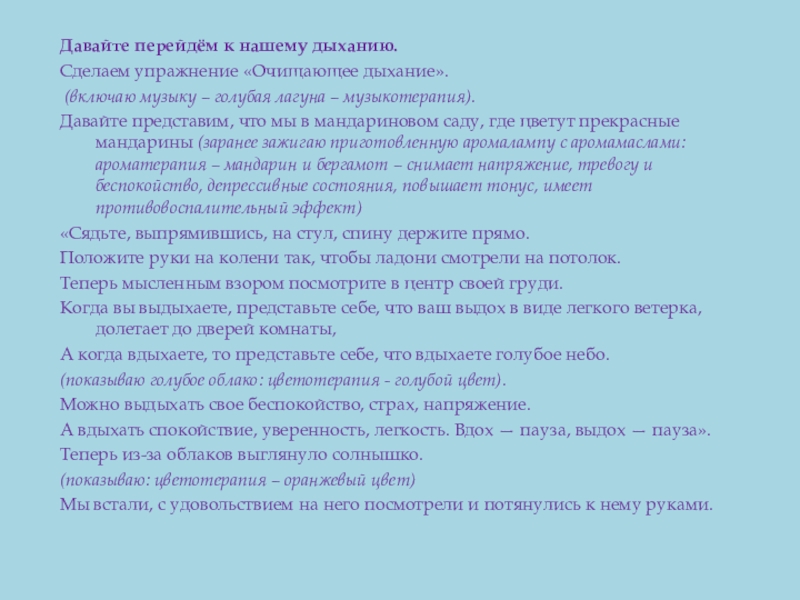 Давайте представим, что мы в мандариновом саду, где цветут прекрасные мандарины (заранее зажигаю приготовленную аромалампу с аромамаслами: ароматерапия – мандарин и бергамот – снимает напряжение, тревогу и беспокойство, депрессивные состояния, повышает тонус, имеет противовоспалительный эффект)