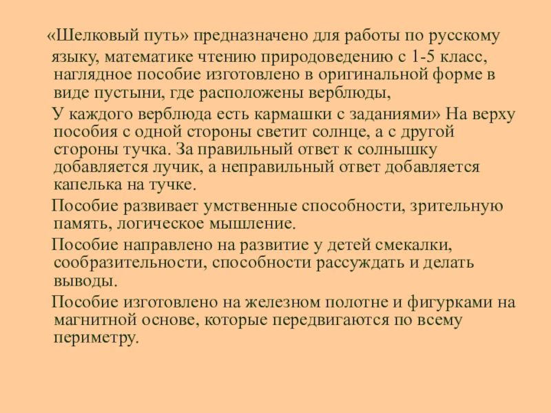 «Шелковый путь» предназначено для работы по русскому языку, математике чтению природоведению с 1-5 класс, наглядное пособие изготовлено в оригинальной форме в виде пустыни, где расположены верблюды, У каждого верблюда есть кармашки с