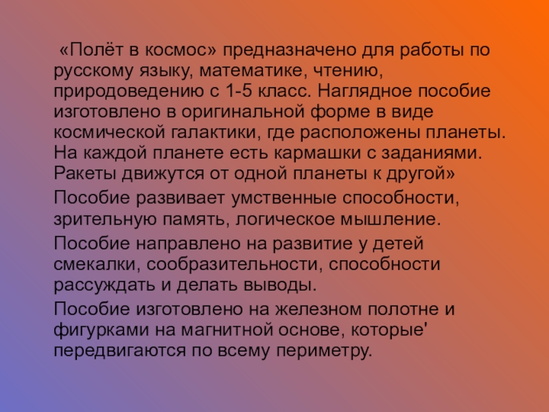 «Полёт в космос» предназначено для работы по русскому языку, математике, чтению, природоведению с 1-5