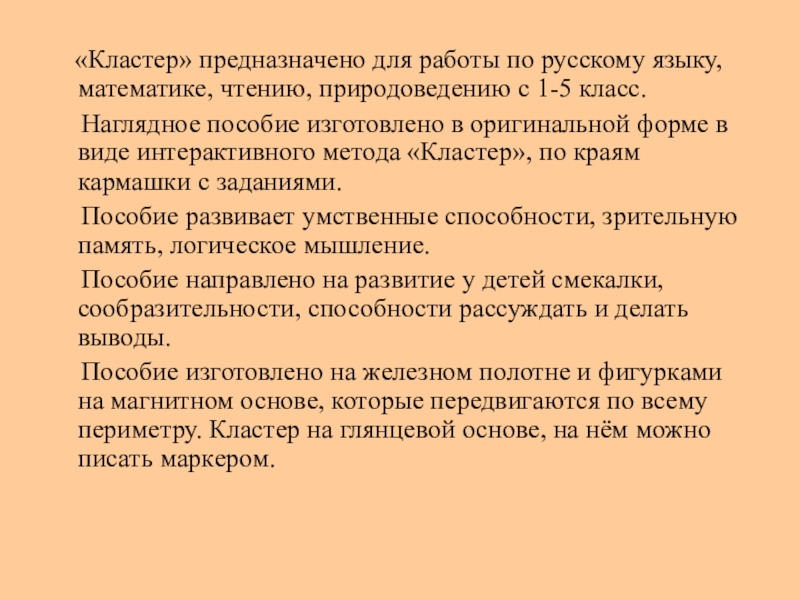 Слайд 8 «Кластер» предназначено для работы по русскому языку, математике, чтению,