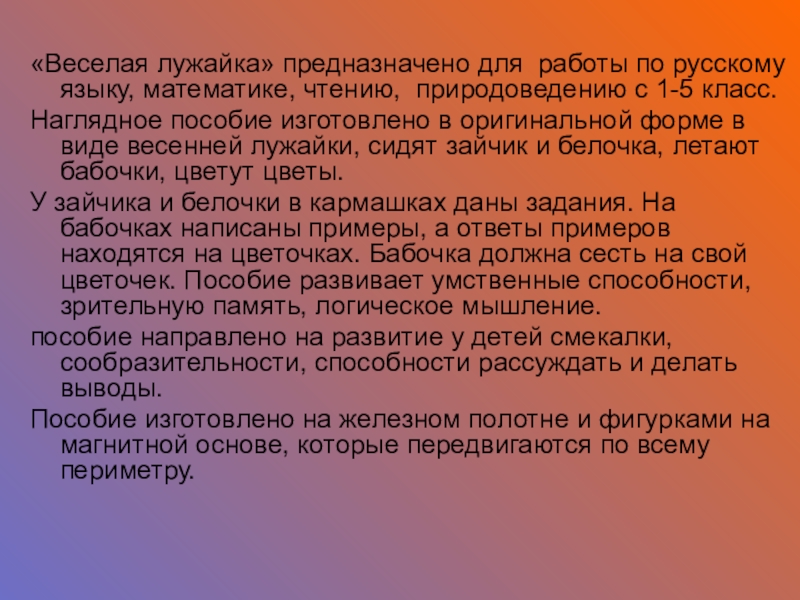 «Веселая лужайка» предназначено для работы по русскому языку, математике, чтению, природоведению с 1-5 класс.Наглядное пособие изготовлено в