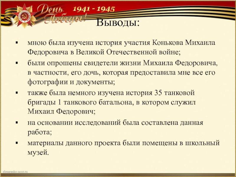Выводы:мною была изучена история участия Конькова Михаила Федоровича в Великой Отечественной войне;были опрошены свидетели жизни Михаила Федоровича,