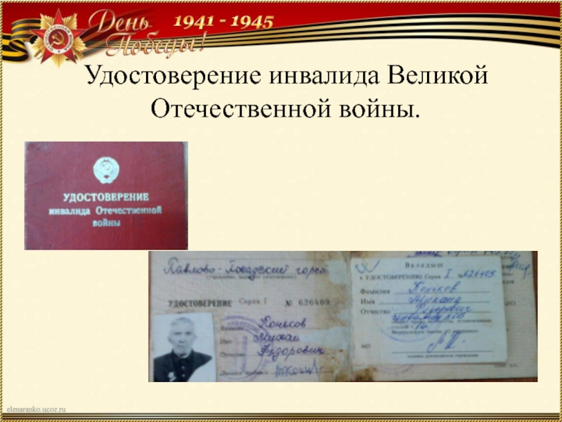 Слайд 8 Удостоверение инвалида Великой Отечественной войны.
