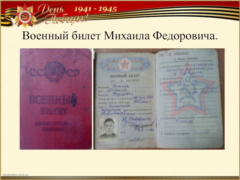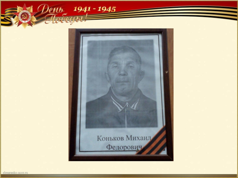 Цель работы:исследование жизненного пути и скромного солдатского подвига рядового солдата Конькова Михаила Федоровича. Задачи:изучить историю участия Конькова Михаила Федоровича в Великой Отечественной войне;на основании изученных документов и фотографий восстановить основные биографические сведения о его жизни;
