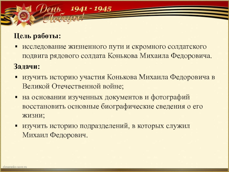 Цель работы:исследование жизненного пути и скромного солдатского подвига рядового солдата Конькова Михаила Федоровича. Задачи:изучить историю участия Конькова