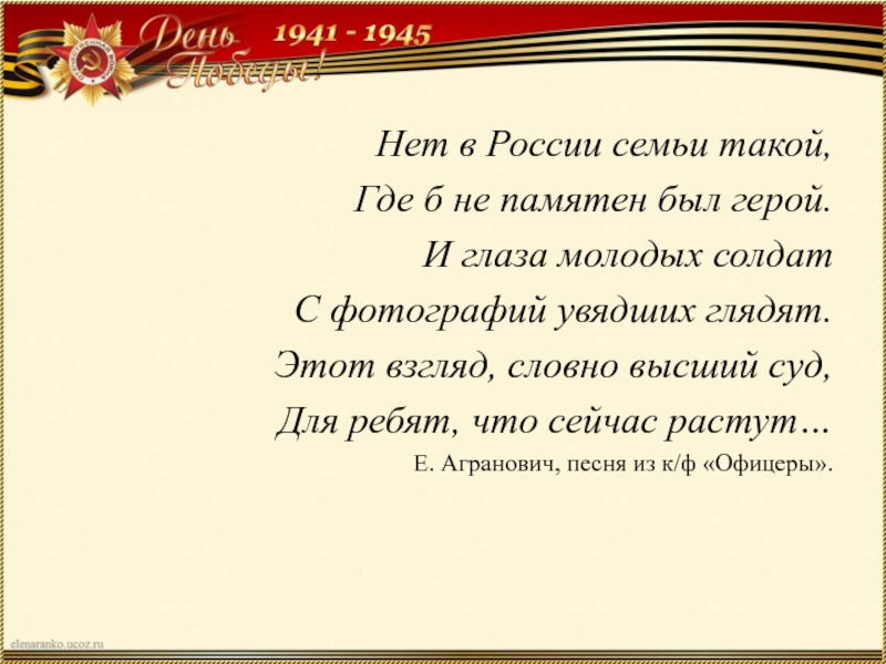 Нет в России семьи такой,Где б не памятен был герой.И глаза молодых солдат С фотографий увядших глядят.Этот