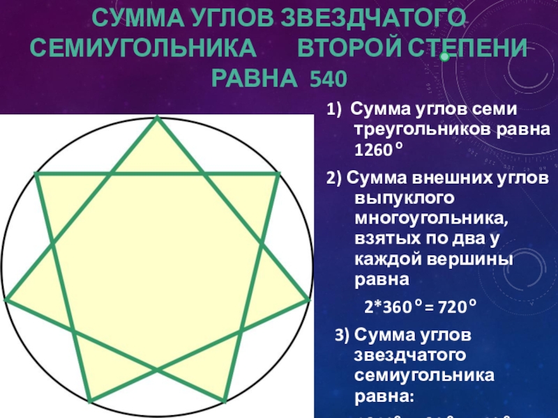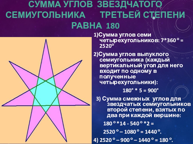 3) Сумма смежных углов для звездчатых семиугольников второй степени, взятых по два при каждой вершине:
