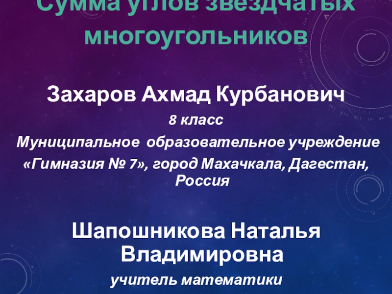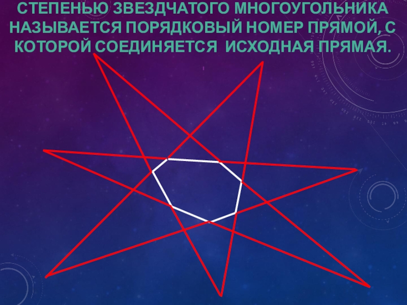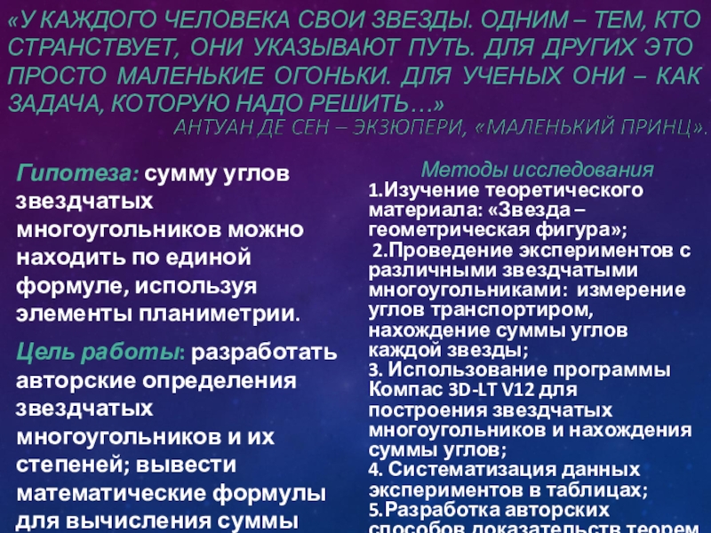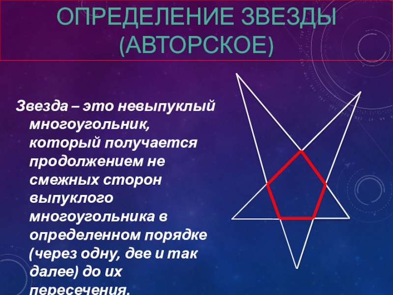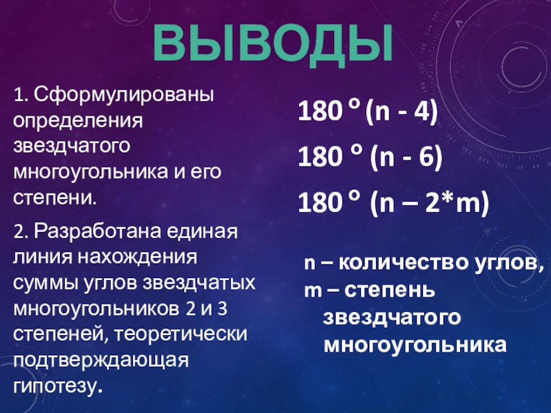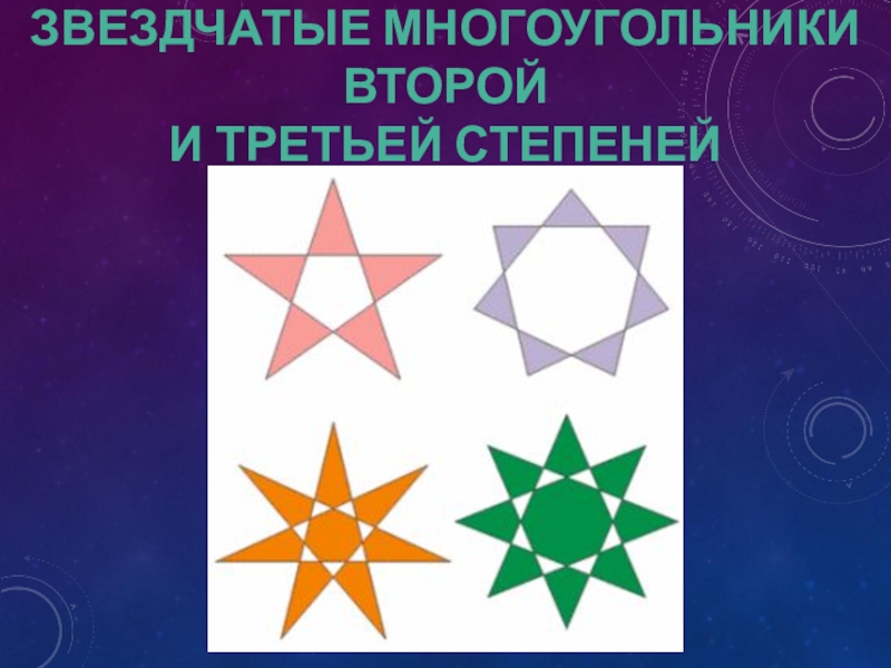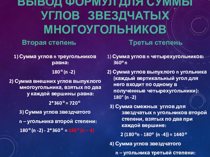Цель работы: разработать авторские определения звездчатых многоугольников и их степеней; вывести математические формулы для вычисления суммы углов звездчатых многоугольников.